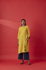 Crafted with naturally dyed khaddar cotton fabric, this A-line kurta features hand Phulkari motifs in indigo on the side and running stitch detailing. The cuffs and the flare are lined with contrasting indigo fabric.