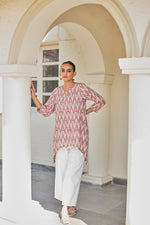 The pale pink color, with a subtle softness and lightness, makes it perfect for the summer months. It has an open neckline and the top flares out at the bottom with traditional phulkari hand-embroidered work all over the top giving it a relaxed look.