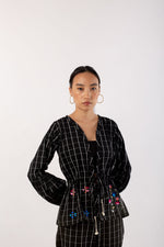 Inspired by the sealife and geometry in Phulkari, drawstring jacket features geometric seaweed and fish motifs hand embroidered on handwoven fabric weaved from recycled cotton & polyester.