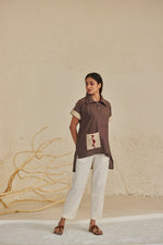 A naturally dyed brown color kurta in khaddar cotton fabric, with moon embroidered phulkari on the pockets. Designed with a running thread design on the front that sets it apart from other kurtas in this season.