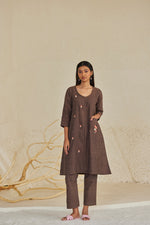 Elevate your wardrobe with the classic, traditional phulkari work on this kurta . Crafted from 100% handwoven cotton, this round neck 3/4th sleeve dark brown color kurta is detailed with moon motifs on the pockets for a timeless style.