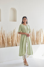 This women's half-sleeve pista green kurta features a minimalist design made of 100% handwoven cotton with moon phulkari hand-embroidered work. This feminine short kurta is ideal for both casual and formal occasions