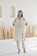 A white cotton kurta is a v-neck collar with running contrast thread work. Vibrant Moon phulkari work on the bottom is adding a sheer elegance to this cotton kaftan. It's perfect for casual wear and can be paired with leggings for an ultra-soft look or shorts for a lively day out.