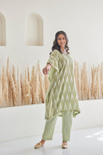 The pista green ikat 100% cotton kurta is the perfect on-the-go outfit for a day out. This versatile piece takes inspiration from the beauty of nature and features a golden phulkari moon motif at the back. The comfortable cotton fabric ensures that you can wear it to work or on lazy weekends.