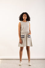 A minimalist dress with hand embroidered Phulkari pockets. This dress features indigo stripes on kora and has been made with 100% handwoven cotton using naturally dyed yarns.