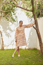 An early spring fashion statement, this mustard ikat flared dress is crafted in 100% cotton fabric. Featuring long sleeves and a wide hemline, it's perfect for adding a pop of color to your wardrobe
