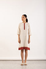 A minimalist and elegant dress featuring golden birds hand embraoidered in Phulkari on the border. This dress features kora stripes with elbow length sleeves. Fabric used is 100% handwoven cotton made with naturally dyed yarns.