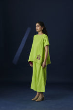 A flared & anti-fit top crafted with 100% cotton khaddar. The Top features a mauve hand Phulkari geometric motif on the side. The inner side had been lined with contrasting mauve fabric. The top can be paired with indigo culottes for a complete look.