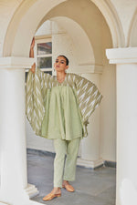 Enjoy a comfortable and casual look with this round neck relaxed fit green color women top. This top features 100% handwoven ikat cotton with running thread work that gives it a special touch in your wardrobe.