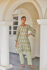 Get the perfect look for any occasion with this stunning round neck long sleeves green color women kurta. Crafted from 100% handwoven ikat cotton fabric , this kurta features a beautiful triangle-themed phulkari embroidery that will bring out the elegance in you. Get ready to turn heads with your unique style and look your best!