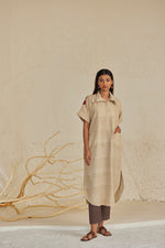 The beige color, with a subtle softness and lightness, makes it perfect for the summer months. It has an collar neckline with front pockets and kaftan with hand embroidered work of phulkari on sleeves. The kurta along handwoven Ikat cotton fabric giving it a relaxed look.