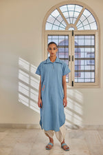 This half sleeves collar pattern kaftan kurta features a gorgeous crescent Phulkari moon motif in running thread work. Made from 100% cotton khaddar, this kurta is perfect for both casual and formal occasions.