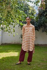 This beautiful mustard color women's spread collar kurta is made entirely of handwoven ikat cotton fabric. The product is brought to life in an elegant manner by the exquisitely detailed phulkari work on the front, pockets, and sleeves. You can layer it over jeans and tights or wear it as a shirt.