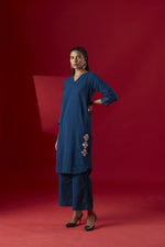 Crafted with 100% Cotton Khaddar fabric, this naturally dyed indigo dress with a pocket and bold hand Phulkari Motif is a statement piece in the wardrobe. It is paired with staright indigo pants for a full look.