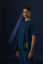 A flared & anti-fit top crafted with naturally dyed indigo 100% cotton khaddar. The Top features a green hand Phulkari geometric motif on the side. The inner side had been lined with contrasting green fabric. The top can be paired with indigo culottes for a complete look.