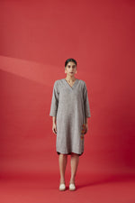 Crafted with 100% Cotton Khaddar fabric, this grey dress with a pocket and bold Phulkari Motifs on the side is a statement piece in the wardrobe. The inner side of the flare has been lined with red fabric, and the sleeves feature running stitch detailing in yellow & red. It can be paired with grey pants for a complete look.