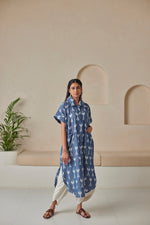 This light blue coloured kurta is a true statement piece with running stitch detailing around the ikat motifs. It's crafted 100% handwoven cotton, in a spread collar half sleeves pattern in ikat fabric.
