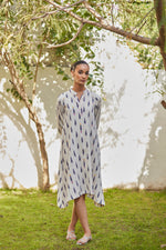 An ikat cotton dress with a bright, hand embroidered Phulkari work spread all over the outfit. This cotton fabric is handwoven and features long ruched sleeves. A versatile piece to wear to work or out on the town.