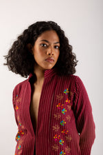 Inspired by the bright colours of Phulkari, Matsya jacket co-ord set features geometric fish motifs hand embroidered on jacket panels, paired with Aab recycled cotton pants. The Base fabric is handwoven with recycled cotton & recycled polyester.