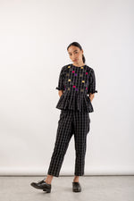 Matsya Peplum Top is inspired by the first Avatar of Vishnu, Matsya and the bright geometric motifs of Phulkari. Hand embroidered with fish motifs on the yoke and knife pleat peplum, this is a statement piece made from handwoven recycled polyester & cotton fabric.
