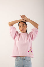 Inspired by the bright colours and geometric flowers of Phulkari, this top features seaweeds hand embroidered in Phulkari with sleeve deatiling. The base fabric has been handwoven using recycled cotton & recycled polyester.