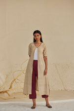 Ace up your look with Aab label's elegant beige cotton handwoven Kurta! Get ready to turn heads with our unique phulkari patterns and running threadwork, expertly crafted to perfection. With our overlaying open neck elbow sleeves, you'll be oozing sophistication and grace like no other. And complete your look with our vibrant red pants for a truly dazzling ensemble.