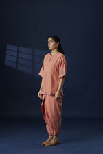 A short peach kurta with grey hand Phulkari motif on the sleeve. The kurta also features hand embroider detailing on the neck and front border. The short kurta has been paired with peach dhoti. The base fabric used is 100% cotton khaddar.