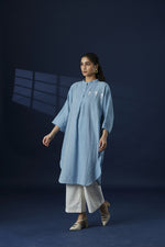 A flowy Kaftan crafted with 100% cotton khaddar fabric, this one is perfect for the summers. The Kaftan features delicate hand Phulkari motifs and multi-colored running stitch detailing on the front. The back has a single statement hand Phulkari motif. It can be worn as it is or paired with Aab Khaddar White Straight pants.