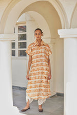 Phulkari hand-embroidered Mustard Ikat Kaftan dress with dhoti