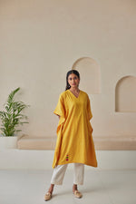 A handwoven cotton kaftan in a charismatic turmeric colour that features a moon Phulkari work on the bottom. The intricate weaving technique creates the most luxurious shade of orange, perfect for the cooler months.