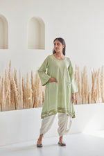 Look effortlessly stylish in this beautiful handmade kurta. The soft and breathable handwoven cotton fabric ensures all-day comfort, while the round neck and long sleeves flatter your figure. The pista green color is sure to add a touch of elegance to any wardrobe with french knots work .