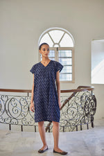 Dark blue ikat kaftan has been crafted with handwoven cotton fabric featuring faggoting lace on the back, hand done running stitch on the front and a V-Neck. The kaftan is perfect for a casual yet stylish look and can be worn as it is or with pants.