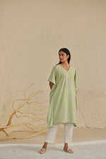 Ace up you look with this v-neck collar pista green Handwoven cotton kaftan with moon phulkari motif on front which make you feel cool, comfortable and beautiful.