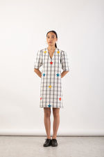 A statement piece from Aab’s Matsya collection, hand embroidered motifs on this shift dress are a fine mix of starfish and bright geometric motifs of Phulkari. The garment has been made using heavy handwoven fabric weaved from recycled cotton and recycled polyester.