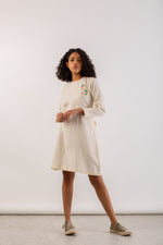 Inspired by the marine life, Twin Fish Dress features a double Matsya motif on the shoulder. The top has been hand embroidered using traditional techniques of Phulkari. Base fabric used is Malkha, a fine 100% cotton handloom from Telangana.