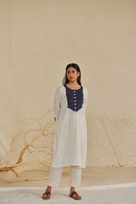 Get ready to shine bright like a diamond with our exclusive, handmade Kurta! Designed with elegance and comfort in mind, this white-colored Kurta features a round neck, 3/4th sleeves and an ikat fabric on the yoke area. Crafted from 100% handwoven cotton with running stitch and detailed work, it is perfect for any occasion!