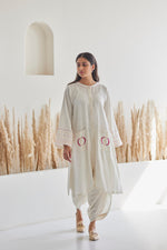 Make a statement with feminine elegance in this beautiful kurta for women . With detailed phulkari work of moon motifs and running threadwork on the sleeves, this round neck 3/4th sleeve white color handwoven cotton kurta will make its mark at any event you wear it to.