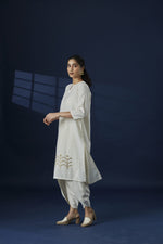 A classic straight white kurta, crafted with 100% cotton khaddar fabric. The border features an intricate jaal of geometric Phulkari motif in golden patt silk thread and running stitch detailing on the sleeve. The kurta can be paired with white stitched dhoti/pants.