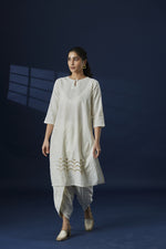 A classic straight white kurta, crafted with 100% cotton khaddar fabric. The border features an intricate jaal of geometric Phulkari motif in golden patt silk thread and running stitch detailing on the sleeve. The kurta can be paired with white stitched dhoti/pants.
