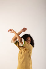 An easy to wear dress featuring intricate hand embroidered Phulkari on sleeves. The base fabric of this dress has yellow and kora pin stripes made of 100% handwoven cotton using naturally dyed yarns.